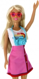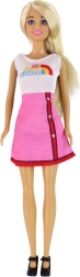 Lutka Mama ima moderno bijelu majicu s engleskim natpisom i ružičastu suknju s detaljima gumba.