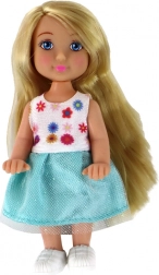 Lutka Kći je obučena u bijelu majicu s raznobojnim cvjetovima i svijetloplavu suknju, spremna za dječju igru.