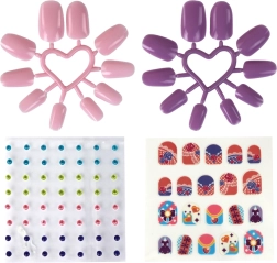Sadrži umjetne nokte, naljepnice i lakove za nokte u dvije boje za različite stilizacije.