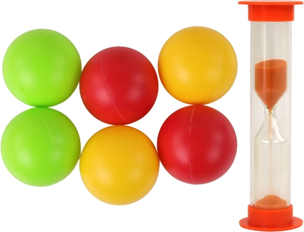 Set loptica u tri boje za više igrača te pješčani sat za vremenski ograničene runde daju igri dinamiku i napetost.