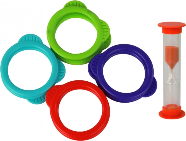 Set sadrži kolutove u četiri boje i pješčani sat za brzo natjecateljsko kolo. Namjestite vrijeme i pokušajte nabaciti što više kolutova prije nego što pijesak iscuri.