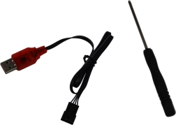 U pakiranju je sve za trenutačni start: model s akumulatorom 7,4 V 500 mAh, USB punjač, odašiljač i naljepnice za personalizaciju. Potrebno je dodati samo 2× AA baterije u upravljač.