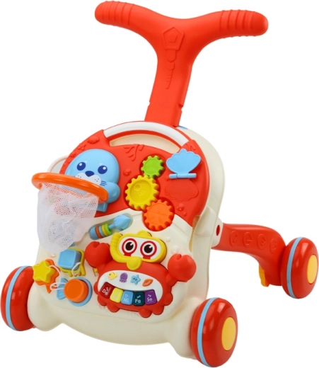 Prednju stranu gurala čini odvojivi panel pun šarenih i interaktivnih elemenata koji potiču istraživanje. Pokretni dijelovi se okreću i pomiču, čime stimuliraju osjete i razvijaju kognitivne sposobnosti djeteta. Osim toga, tu je i mala klavijatura u obliku preslatkog raka koja reproducira zvukove i melodije, a LED diode trepere u ritmu glazbe – pružajući vašem djetetu nezaboravne dojmove i zabavu.