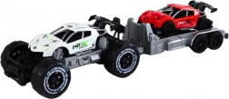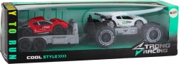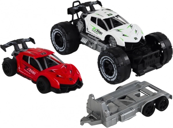 Off-road auto i crveni sportski automobil na prikolici predstavlja izvrstan set igračaka za djecu koja vole automobilske avanture. S robusnim kotačima i čvrstom konstrukcijom spreman je za svaki terenski izazov.