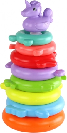 Djeca slažu prstenove od najvećeg do najmanjeg, čime prirodno razvijaju logičko razmišljanje, prepoznavanje boja i razvrstavanje. Jednorog na vrhu daje igri čaroban štih.