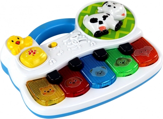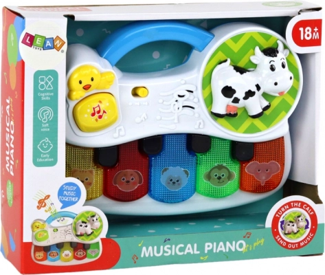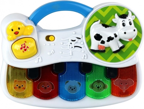 Otkrijte svijet glazbe s ovim kompaktim pianinom za najmlađe. Nudi 5 šarenih tipki sa životinjama, svjetlosne efekte i zvukove koji potiču djetetova osjetila. Pritiskom na žutu tipku svira veselu melodiju, a rotirajuća kravica zaokupit će pažnju i zabaviti. Idealan za razvoj fine motorike, slušnog opažanja i mašte.