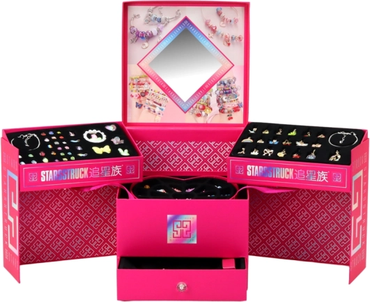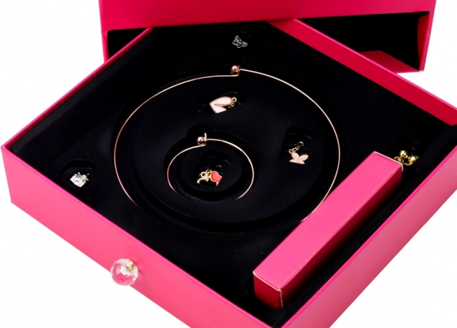 Ovaj raskošni set za izradu nakita u ružičastoj kutiji za nakit (26 × 23 × 23 cm) oduševit će svako dijete koje voli stvarati. Nakon otvaranja stijenke kutije se razmiču i otkrivaju tri velike police s raznobojnim blagom – od privjesaka u obliku leptirića, cvjetića i zvjezdica do bogatog izbora perlica s prekrasnim uzorcima. U sredini se nalazi veliko srce s pažljivo razvrstanim mini perlicama, a dolje izvlačna ladica s obojenim uzicama, privjescima i zlatnom ogrlicom kao osnovom za vaše originalne komade nakita.
