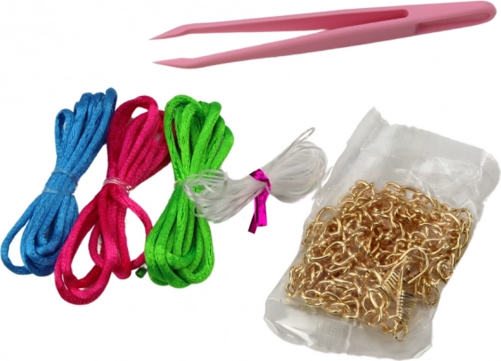 Zahvaljujući raznobojnim špagicama (ružičasta, zelena, plava), najlonskoj struni i dodacima, djeca mogu dizajnirati nakit za različite prilike. U kompletu se nalaze i preslatke gumice i ukosnice za kosu te viseće naušnice na klip – prikladne i za djecu bez probušenih ušiju.