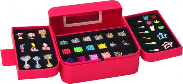 Više pretinaca za jednostavno razvrstavanje perlica, naušnica i dodataka. Zrcalo olakšava isprobavanje gotovih kreacija i održava sve na svom mjestu.