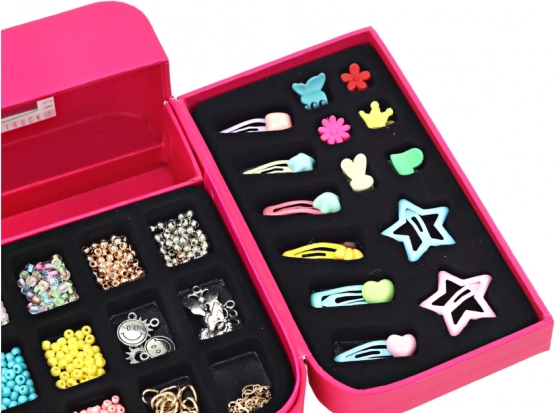 Ovaj bogato opremljen set potiče kreativnost, finu motoriku i estetski osjećaj. Unutra ćete pronaći raznoliku mješavinu perlica, privjesaka i komponenti za izradu originalnih narukvica i dodataka. Kutija za nakit s integriranim zrcalom i pretincima sve će održati uredno organiziranim.