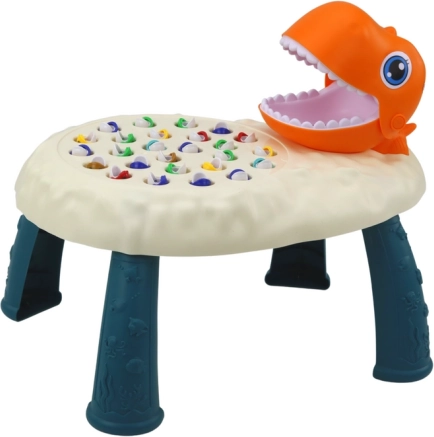 Veseli dinosaurov stolić pretvara lov na ribice u napetu igru. Otvarajuće ralje narančastog dinosaura služe kao cilj u koji igrači ubacuju ulovljene ribice. Djeca tijekom igre razvijaju preciznost, koncentraciju i zdravo natjecanje, dok se pritom odlično zabavljaju.