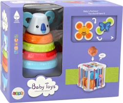 Ovaj set sadrži tri raznolika elementa, od kojih svaki djetetu pruža jedinstvena iskustva i izazove. Tornjić s koalom i kotačićima pomaže djetetu razvijati finu motoriku stavljanjem kotačića na prava mjesta, a ujedno pruža zabavu zahvaljujući njihajućem pokretu koale.