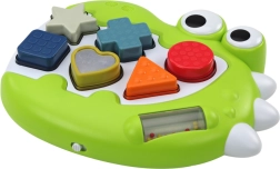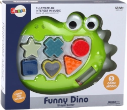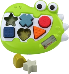 Ovaj interaktivni dinosaur spaja pametnu igru sa senzoričkom stimulacijom. Nakon uključivanja otvori za oblike zasvijetle, a pri pravilnom umetnju dijela zazvuči radosna melodija koja dijete motivira na daljnje pokušaje. Djeca se prirodno uče prepoznavati oblike i boje, vježbaju koordinaciju oko–ruka te otkrivaju zvučne i taktilne poticaje.