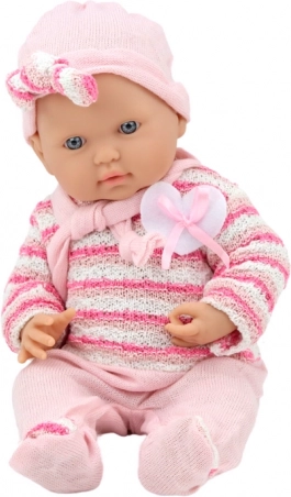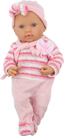 Čarobna beba lutka u ružastom prugastom džemperiću s kapicom i šalom razveselit će svaku malu njegovateljicu. Ima realistične crte i pokretne ruke i noge, izrađena je od sigurnih i izdržljivih materijala. Dimenzije lutke 39 × 18 × 10,5 cm, dob 18+ mjeseci, certifikati CE i EN 71.