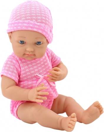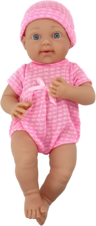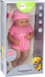 Tekstilni ružičasti komplet s kapicom, realistične crte i plave oči daju lutki poseban šarm. Praktična duda na vrpci ne gubi se i obogaćuje scenarije igre brige.
