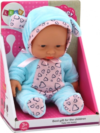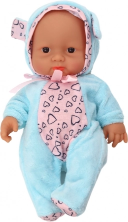 Preslatka mala lutkica – beba u plavoj odjeći sa srčekima i kapicom s ušima razveselit će svaku djevojčicu. Ima pokretne ruke i noge, okretnu glavu i zahvaljujući kompaktnim dimenzijama 21 × 14 × 6,5 cm prikladna je za putovanja i dječji krevetić. Igračka je CE certificirana i udovoljava normi EN71, pogodna od 3 godine.