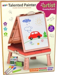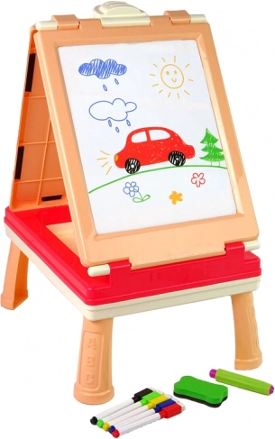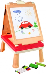 Podržite maštu i učenje djece s univerzalnom pločom 3u1. Jedna je strana namijenjena crtanju kredom, a druga pisanju i bojanju suhim brisanjem flomasterima. Zahvaljujući čvrstom stoliću sve je stabilno, a djeca imaju pri ruci pribor i ploče za igre.