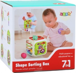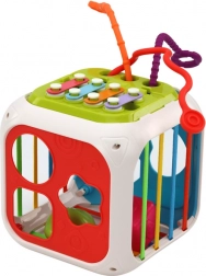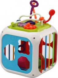 Dijete može vježbati prepoznavanje oblika i boja ubacivanjem kocki u odgovarajuće otvore u sortirnoj kocki. Ovo je izvrsna metoda za razvoj manualnih vještina i koordinacije pokreta. Uklonjivi zid kocke skriva dodatne atraktivne elemente kao što su činele, zupčanici i užad za interaktivnu igru.