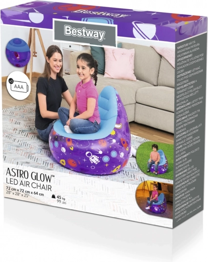 Na napuhavanje fotelja Bestway sa svemirskim motivima pretvara svaku dječju sobu ili igraonicu u zabavnu zonu. Integrirano LED osvjetljenje stvara ugodnu atmosferu pri čitanju, igranju i odmoru. Zahvaljujući maloj težini, fotelja je lako prenosiva i pogodna i za terasu ili vrt.