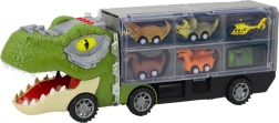 Otkrijte zabavu s dinosaurovim kamionom koji spaja transporter autića i svijet dinosaura. Prednji dio krasi velika dinosaurova glava, a tu su i svjetlosni efekti te realistični zvukovi kamiona i rikanje dinosaura. U prikolici je mjesto za cijelu kolekciju, a u pakiranju ćete pronaći 6 vozila uključujući 4 dinosaurus autića, auto s prikolicom i helikopter.
