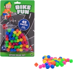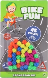 Šarene ukrasne perlice za bicikl. Materijal: plastika. Pakiranje sadrži 45 perlica. Nakon ugradnje pomiču se gore-dolje ovisno o kretanju kotača. Proizvod nije igračka