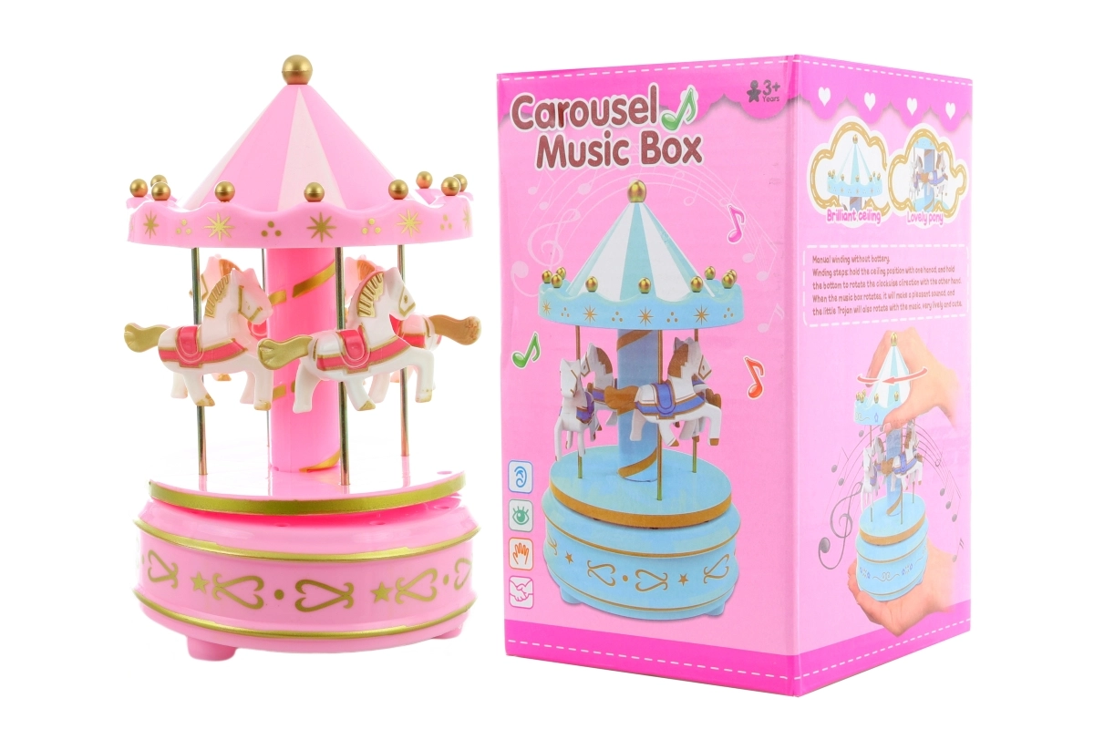 Svirajući vrtuljak. Nakon okretanja vrtuljka svira melodija i vrti se. Veličina cca 11 x 11 x 18 cm. Pakirano u kutiji. Nije na baterije, radi ručno. Dob 3+