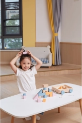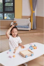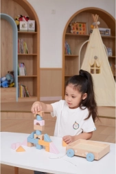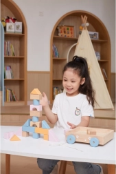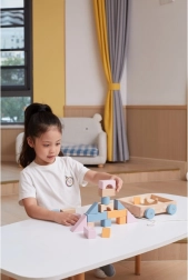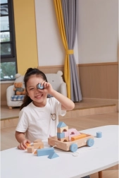 Kocke su izrađene od bukovog drveta, obojene u harmonijskim bojama i sigurne za djecu. Nakon igre, kockice se mogu spremiti natrag u vagon, što omogućuje lako organiziranje. Zahvaljujući uzici, dijete može vući vagon s kockama duž poda, što je zabavno i praktično.