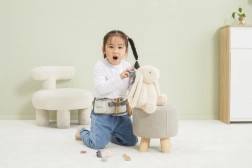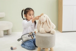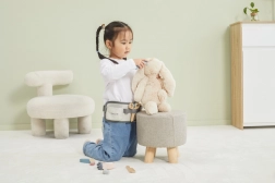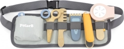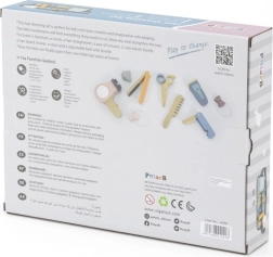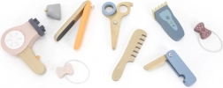 Ovaj frizerski set osmišljen je kako bi djeca mogla razvijati svoju kreativnost kroz igru uloga. Sadrži razne drvene alate, poput sušila, češlja, pegle za kosu, škara, brijaćeg aparata i britve. Uz podesivi pojas djeca imaju sve potrebno uvijek pri ruci. Sve igračke su sigurne i obojene netoksičnim bojama od drva.