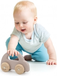 Drveni autić na guranje savršena je igračka za djecu već od šest mjeseci. Zahvaljujući jednostavnom dizajnu i ugodnim pastelnim bojama, lako ga je uhvatiti malim dječjim ručicama. Kotači autića su tihi i osiguravaju gladak pomak tijekom igre. Autić je siguran zahvaljujući zaobljenim rubovima te je obojen netoksičnim bojama.