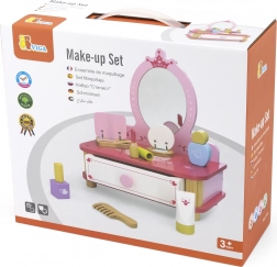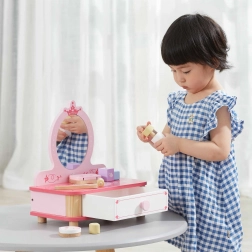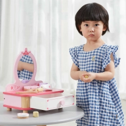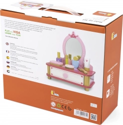 Prekrasni ružičasti toaletni stolić marke Viga idealan je dodatak svakoj dječjoj sobi. Set sadrži ogledalo, kliznu ladicu i raznovrsne drvene dodatke za stvaranje čarobnog svijeta punog mašte. Izrađen od kvalitetnog drva i obojen netoksičnim bojama sigurnim za djecu.