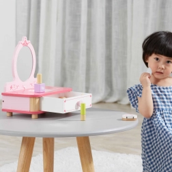 Ružičasti toaletni stolić s elegantnim dizajnom koji obuhvaća kvalitetan drveni materijal i netoksične boje koje osiguravaju sigurnost za djecu.