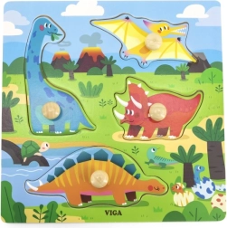 Drvene slagalice s dinosaurima jedinstvena su igračka koja spaja zabavu i učenje. Sadrži 4 različita dijela slagalice koji se zahvaljujući praktičnim gumbićima lako hvataju i postavljaju na pravo mjesto na drvenoj ploči. Upadljive boje i realistični oblici dinosaura potiču djecu na daljnju igru i učenje.