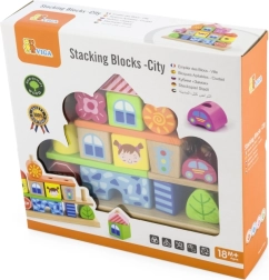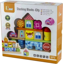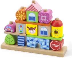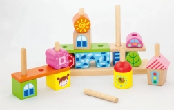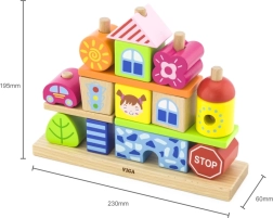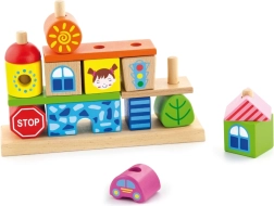 Ovaj razigrani set pretvara dječju sobu u mali grad od drvenih kocki. Sadrži 8 štapića za stabilno nizanje elemenata, 4 predloška za inspiraciju i 14 različitih kocki s motivima kućica, stabala i prometnih znakova. Djeca mogu slagati prema predlošcima ili stvarati vlastite kompozicije te tako razvijati maštu i logičko razmišljanje.