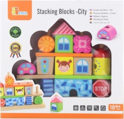 Sastavljajte kućice, ulice i prometne znakove te stvarajte vlastite gradske priče. Kocke se mogu slobodno kombinirati na drvenoj podlozi sa štapićima.