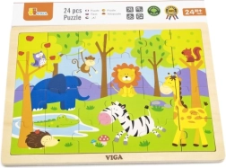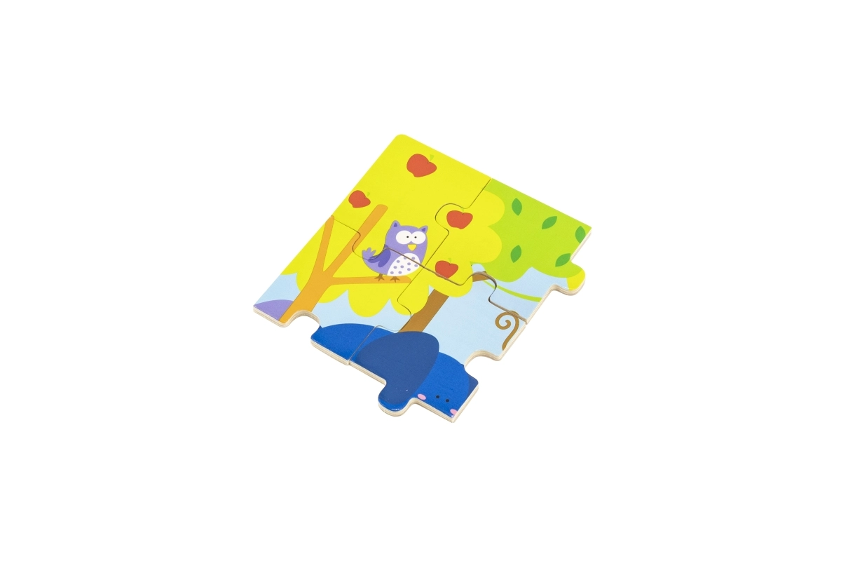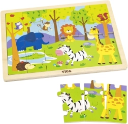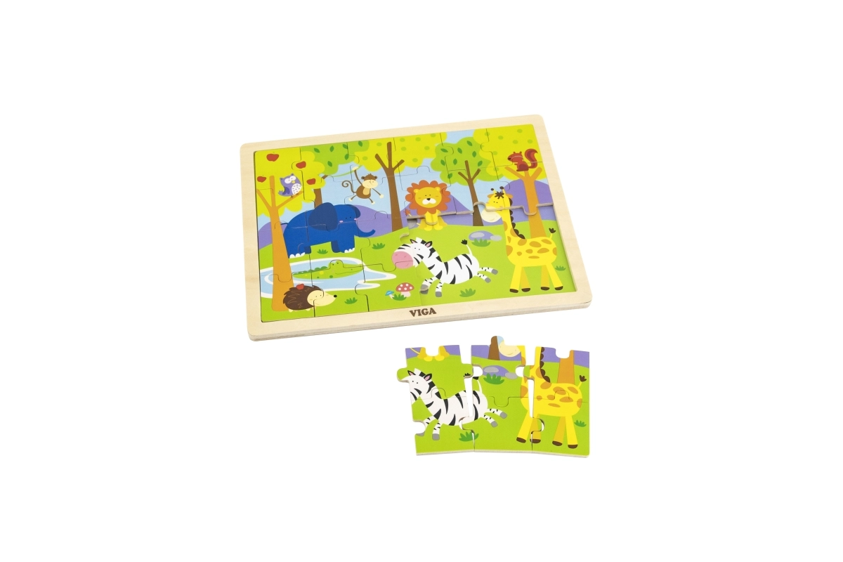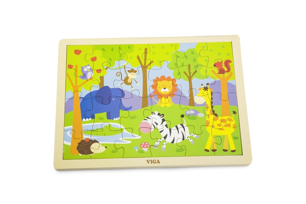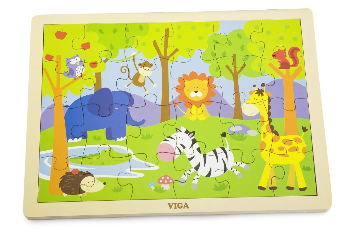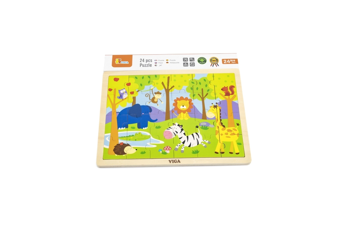Drvene puzzle s motivom zoološkog vrta. Ukupno 24 dijelova. Dimenzije slike cca 27,5 x 20 cm. Dimenzije pakiranja cca 30 x 27 x 1 cm. Dob 24 mj.+
