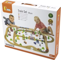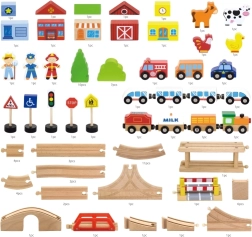 • Set od 90 dijelova s tračnicama, mostom, rampama, 2 vlakića, autima, figuricama, životinjama i dodacima.