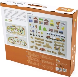 Ova sveobuhvatna drvena željeznička pruga donosi djeci sve što im je potrebno za izgradnju vlastitog malog svijeta. Zahvaljujući 90 dijelova, mali graditelji mogu kombinirati različite oblike tračnica, mostove i križanja, dodavati vozila, figurice i elemente prirode. Prirodno drvo u kombinaciji s izraženim bojama djeluje bezvremenski i potiče osjetilnu percepciju.