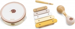 Set sadrži tamburin, ksilofon s palicom i marakas – sve u kompaktnoj veličini za dječje ruke.