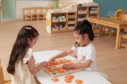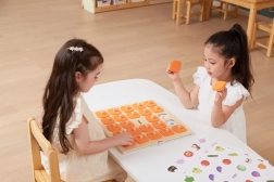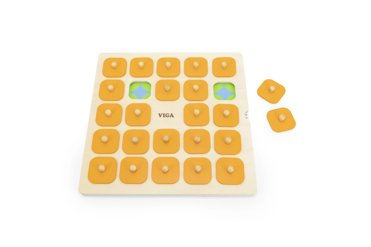 Masivna drvena ploča s 25 četvrtastih prozorčića i narančastim poklopcima s hvataljkama izdržljiva je i udobna za male dječje ruke.
