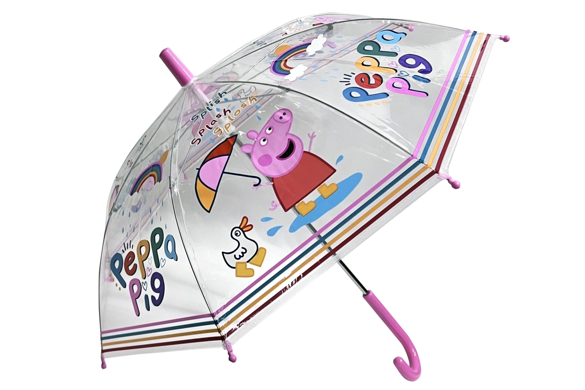 Ručni kišobran s motivom omiljenog lika Peppa Pig. Dimenzije otvorenog kišobrana otprilike 65 x 65 x 60 cm. Dimenzije pakiranja otprilike 60 x 8,5 x 4 cm. Pakirano u plastičnoj vrećici.