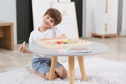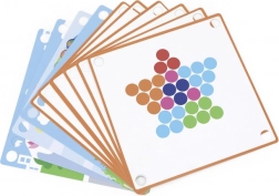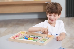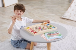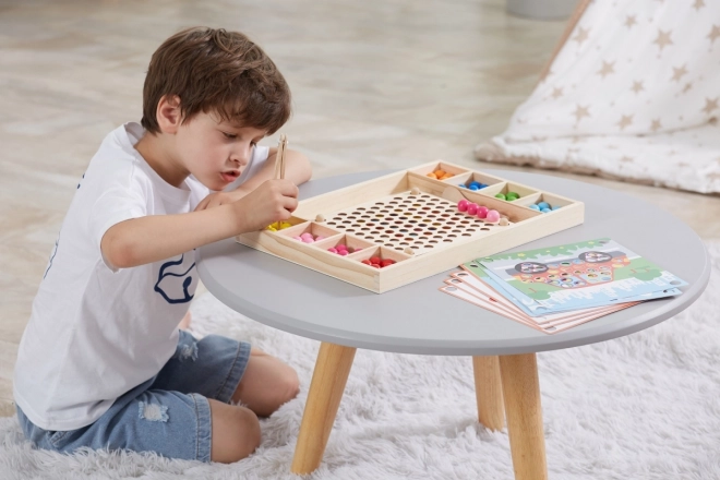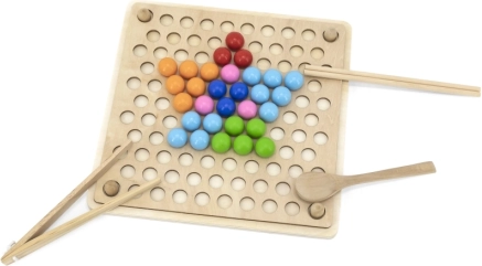 Drvena edukativna igra "Ulovi i Poredaj" omogućuje djeci isprobavati različite uzorke i boje prema priloženim kartonima ili vlastitoj mašti. Uz ovu igru djeca mogu pričvrstiti papir na drvenu podlogu te uz pomoć štapića, žličice ili klipa umetati obojene kuglice u otvore na ploči. Na kraju mogu stvoriti lijepe slike.