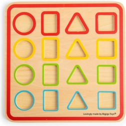Set sadrži čvrstu osnovnu ploču i 16 drvenih dijelova različitih oblika i boja. Kompaktna dimenzija ploče 25 × 25 × 0,9 cm prikladna je za dječji stol i putovanja te se lako posprema.