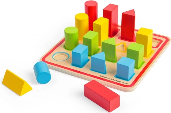 Ova drvena umetajuća slagalica idealna je didaktička igračka za najmlađe. Djeca razvrstavaju i umeću oblike u odgovarajuće otvore, čime prirodno vježbaju prostornu predodžbu, strpljenje i koordinaciju pokreta. Glatki drveni dijelovi lako se drže i potiču na ponavljanu igru.