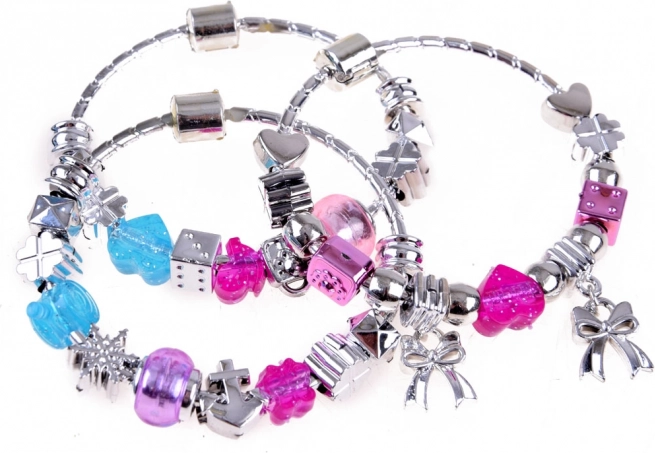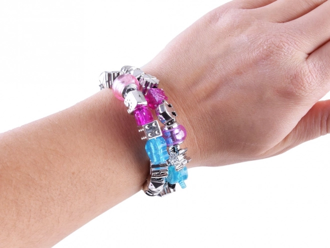 Set sadrži 3 plastične narukvice, 2 šarene uzice, ružičaste i plave perlice te srebrne privjeske charms – dovoljno je samo početi stvarati.