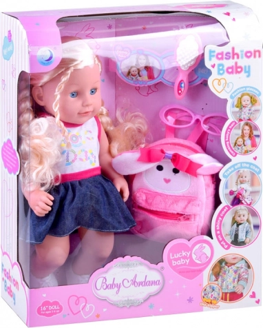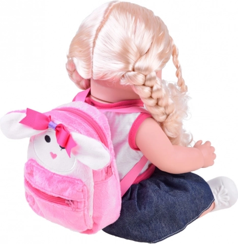 Lutka lako sjedi i stoji uz oslonac. Ružičaste naočale i plišani ruksak s uškama zečića potiču maštu i slatki stil.