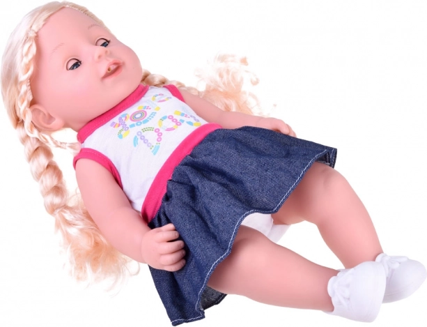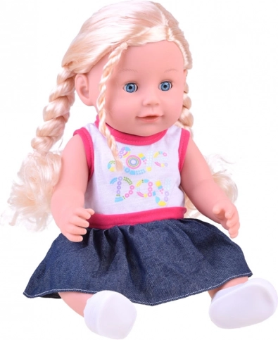 Ova šarmantna lutka visoka približno 40 cm izrađena je od sigurnog, kvalitetnog materijala te impresionira realističnim detaljima lica i nježnim osmijehom. Duge plave vlasi ispletene u pletenice pozivaju na češljanje i stiliziranje, a plave oči sa zatvarajućim mehanizmom daju igri dozu autentičnosti.