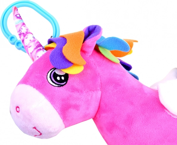 Ovaj mekani jednorog u nježnim, razigranim bojama osvojit će djecu na prvi pogled. Sigurne izvezene oči uklanjaju rizik gutanja sitnih dijelova, a šarene etiketice na grivi i repu potiču hvatanje i vježbanje prstića. Praktična kopča omogućuje brzo pričvršćivanje na kolica, autosjedalicu ili krevetić, pa je igračka uvijek pri ruci.