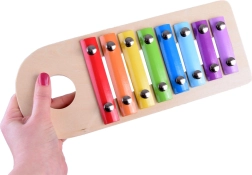 Ovaj drveni ksilofon sadrži 8 metalnih pločica koje omogućuju sviranje cijele ljestvice. Djeca mogu lagano udarati palicom za nježne tonove ili jače za glasniji zvuk, stvarajući tako zabavno glazbeno iskustvo.