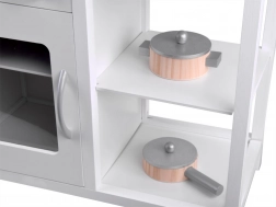 Otvarajuća mikrovalna, ormarić s policom i magnetskim vratima, otvorena polica i praktičan pribor potiču kreativnu igru i održavaju red u kuhinjici.