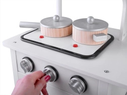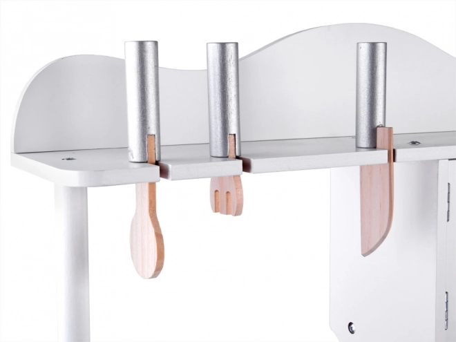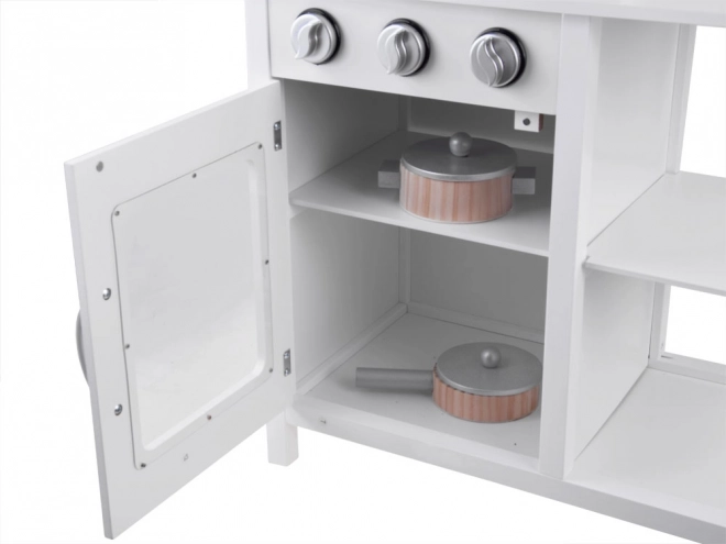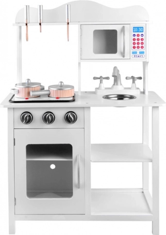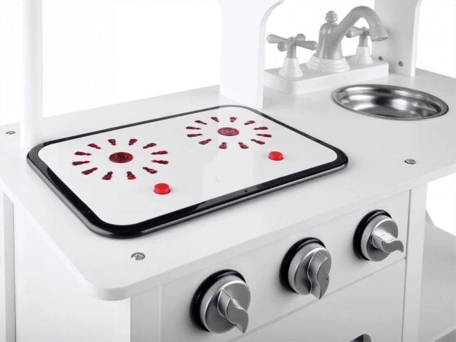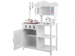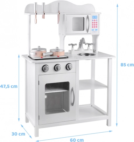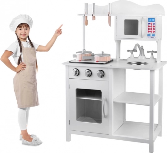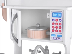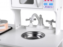 Stilna bijela drvena dječja kuhinjica za male kuhare s indukcijskom pločom sa svjetlima i zvukovima, metalnim sudoperom, mikrovalnom i bogatim priborom. Potiče kreativnost, maštu i finu motoriku te nudi sate zabave u igri kuhanja.